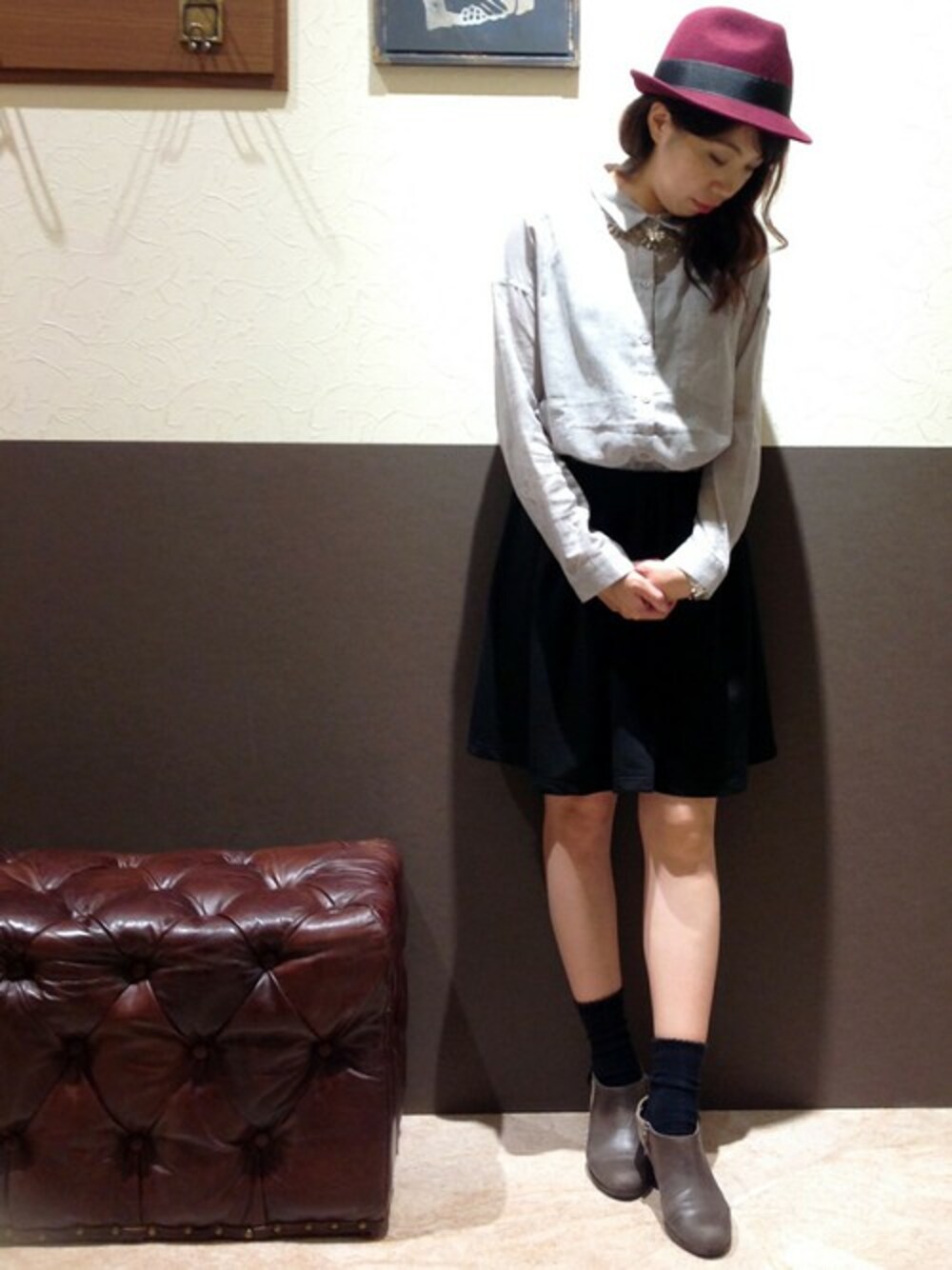 落ち着きのあるシャンブレー調のプリントを施したシャツは、ドロップショルダーのゆるさが可愛いアイテム。 今年らしいトップスインのスカート合わせに小物で季節感を取り入れました。