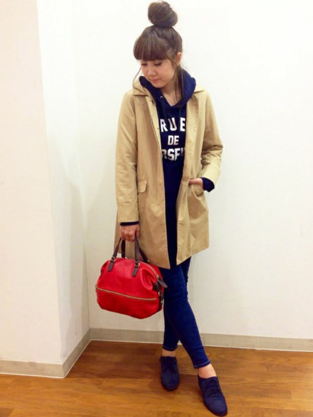 ロゴのプルパーカーをネイビーのアイテムで統一しながらコーディネート。 ステンカラーコートを合わせればラフ過ぎない大人カジュアルスタイルの完成です。