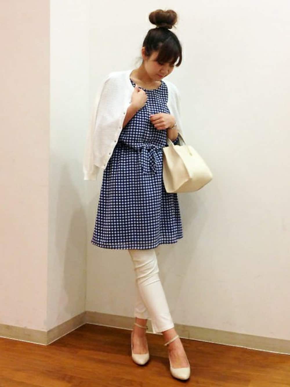 ホワイト×ブルーの爽やかなコーディネート。 トレンドのギンガムチェックで、より今年らしいスタイリングに仕上げました。 小物はシンプルにするのがポイントです。