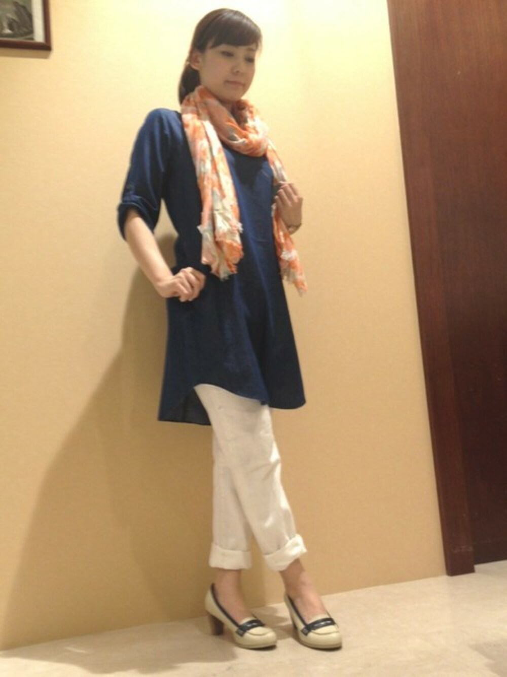 デニムワンピースにホワイトパンツを合わせ、きちんと感とカジュアルを両立させたコーディネート。 袖とボトムの裾を折り返して、初夏まで活躍する爽やかなスタイルに仕上げました。 柄・色ともにアクセントとなる花柄ストールをプラスするのがポイント☆