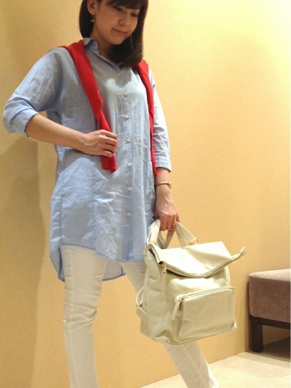 軽やかで爽やかなシャツワンピースに白のアンクルパンツを合わせて春らしい印象に♪ こちらのシャツワンピースはドルマン袖になっているため、肩まわりがゆったりとしていて窮屈さがないのもポイントです。 そして欠かせないアイテムが差し色のカーディガンで、肩掛けしても、もちろん袖を通しても◎ カラバリも豊富でこちらのレッドや、ブルー・イエローといったカラーが全体の印象をぐっと上げてくれます。