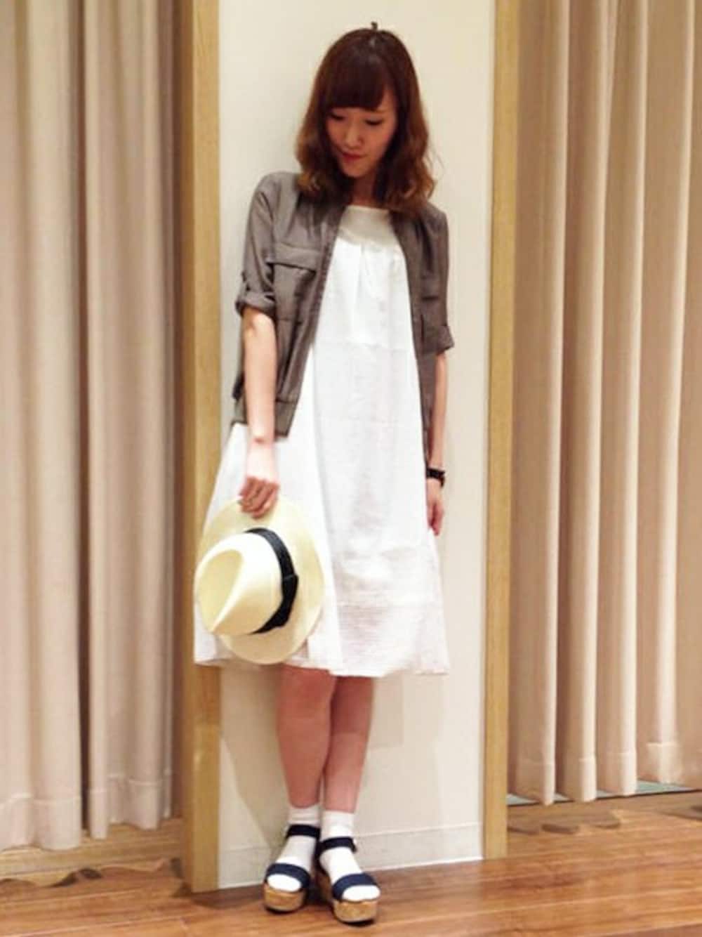 ミリタリーテイストのブルゾンを効かせた、大人可愛いコーディネートです。 落ち感のある素材感のジャケットはシックな色味で大人っぽさをプラス。 サンダルのソックス合わせもポイントに。