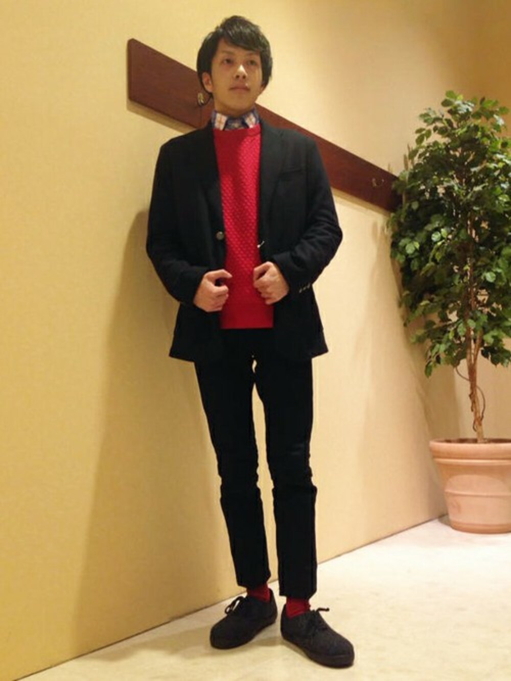 ニットの差し色を効かせたジャケットスタイル。 ソックスと統一したレッドがポイントです。 インに合わせたチェックシャツが、カジュアルなアクセントを加えます。