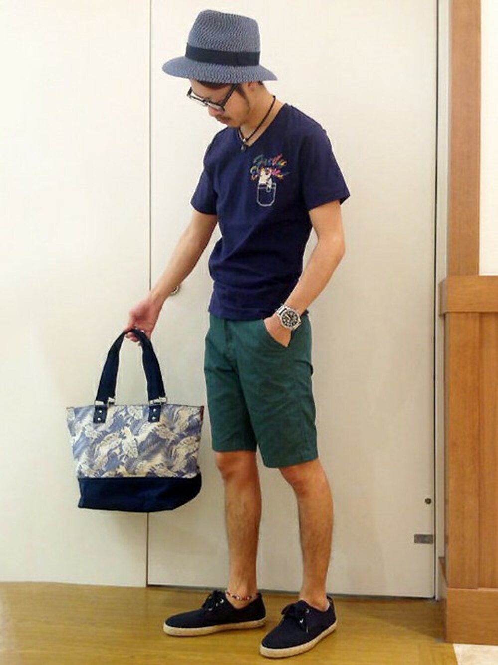 テーマカラーをネイビーでスタイリング。 Tシャツはポケット風のプリントでアート感がありアクセントになっています。 ショートパンツにはグリーンを合わせてアウトドアなテイストをMIX。 グッズをネイビー系で合わせ、濃淡をつけることでメリハリをつけました。 ハットはやや光沢があってこれもポイントです。 夏を先取りしながら大人なトーンで整えました。