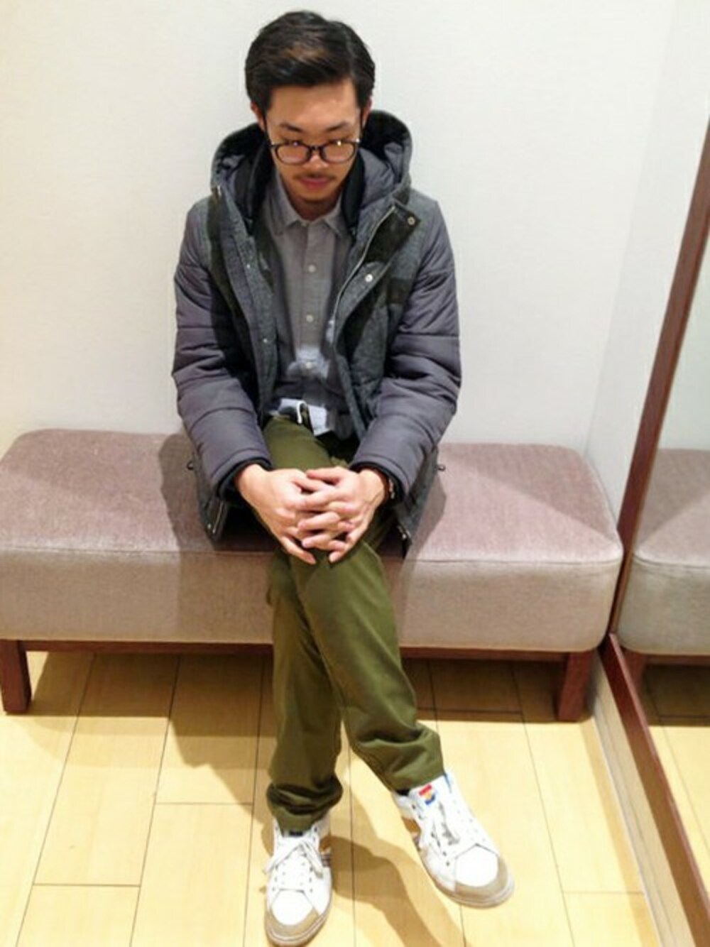 カーキを差し色にした、シンプルコーディネートです。 まるで編地のようなドット柄のシャツとダークカラーのジャケットが大人っぽい印象。 スニーカーを合わせてかっちりさせ過ぎないようにしました。