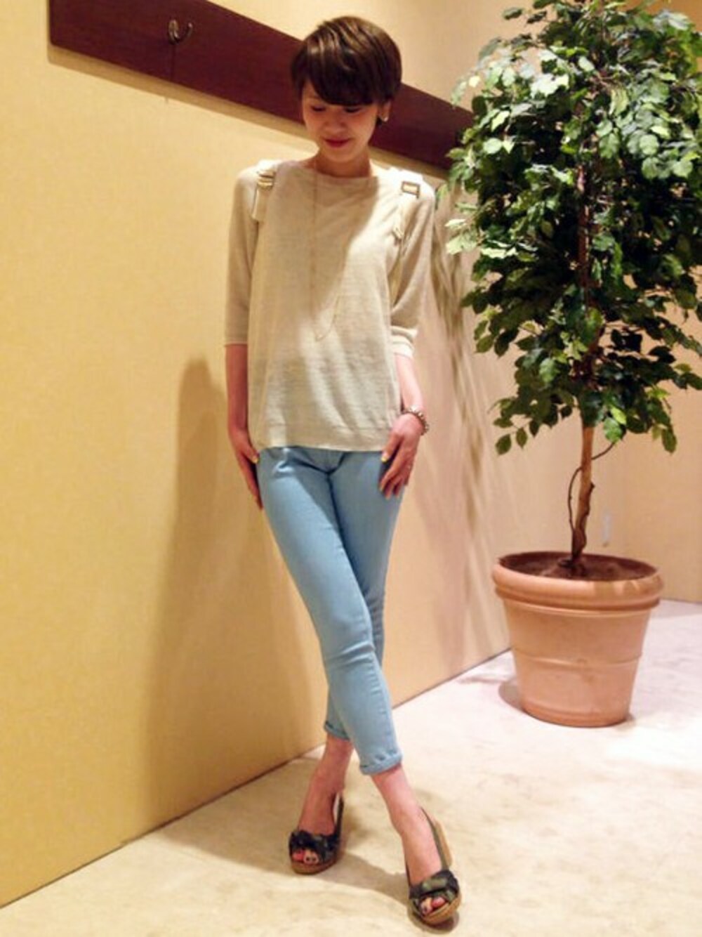 動きやすくて涼しげなサマーニットは夏のらくちんコーデに最適。 ベージュとデニムの淡いカラーも好相性です。 休日のリラックススタイルにおすすめ♪