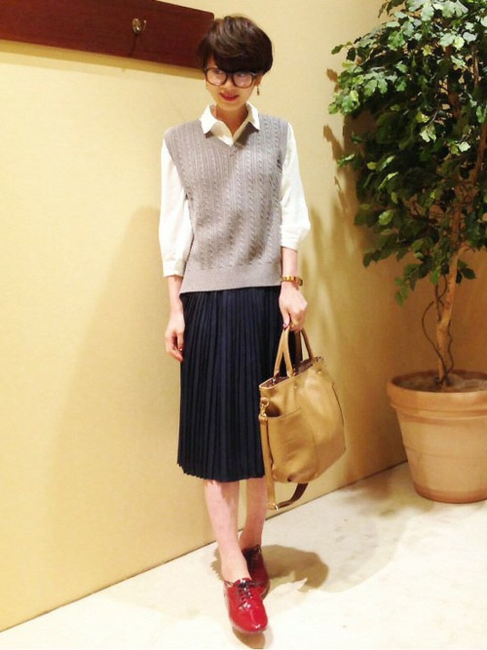 街歩きにおすすめなキレイめスタイルです。 ニットベストにプリーツスカートを合わせて女性らしいラインにしました。 無彩色に足元でボルドーを差したのがポイントです。
