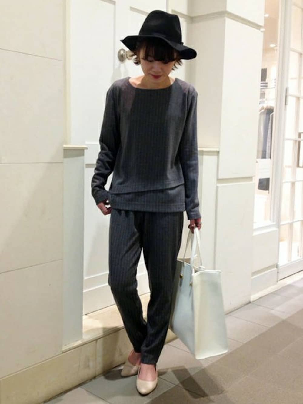 オンにも着られるセットアップを、タウンユースにコーディネートしました。 ジャケットやパンプスと合わせればビジネスシーンにも◎ さりげないストライプと、大人っぽいモノトーンがポイントです。
