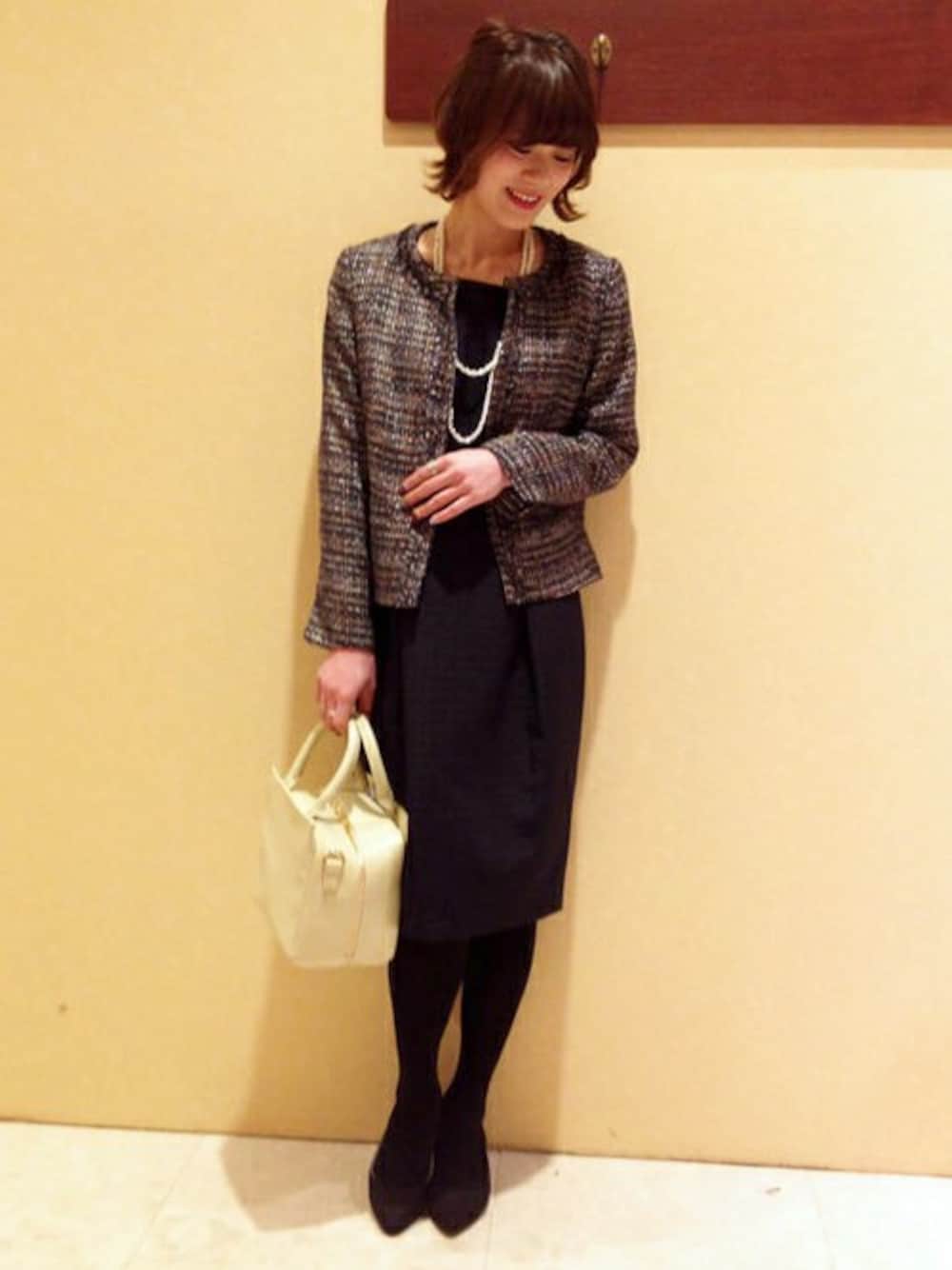 女子会からセレモニーシーンまで着られるワンピーススタイルです。 今期らしくノーカラーのジャケットと合わせれば、女性らしく華やかな印象に。 一枚でも二次会やパーティーにも着られるのも嬉しいコーディネートです。