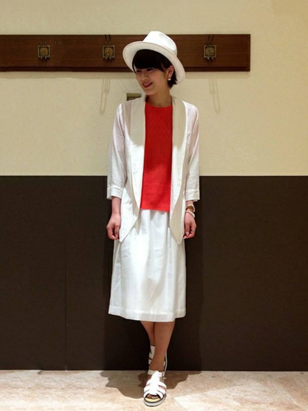 ホワイトのジャケットとスカートを組み合わせたきちんとコーデ。 差し色に赤系を加えて華やかな印象にしました。 デートやお呼ばれに最適です。