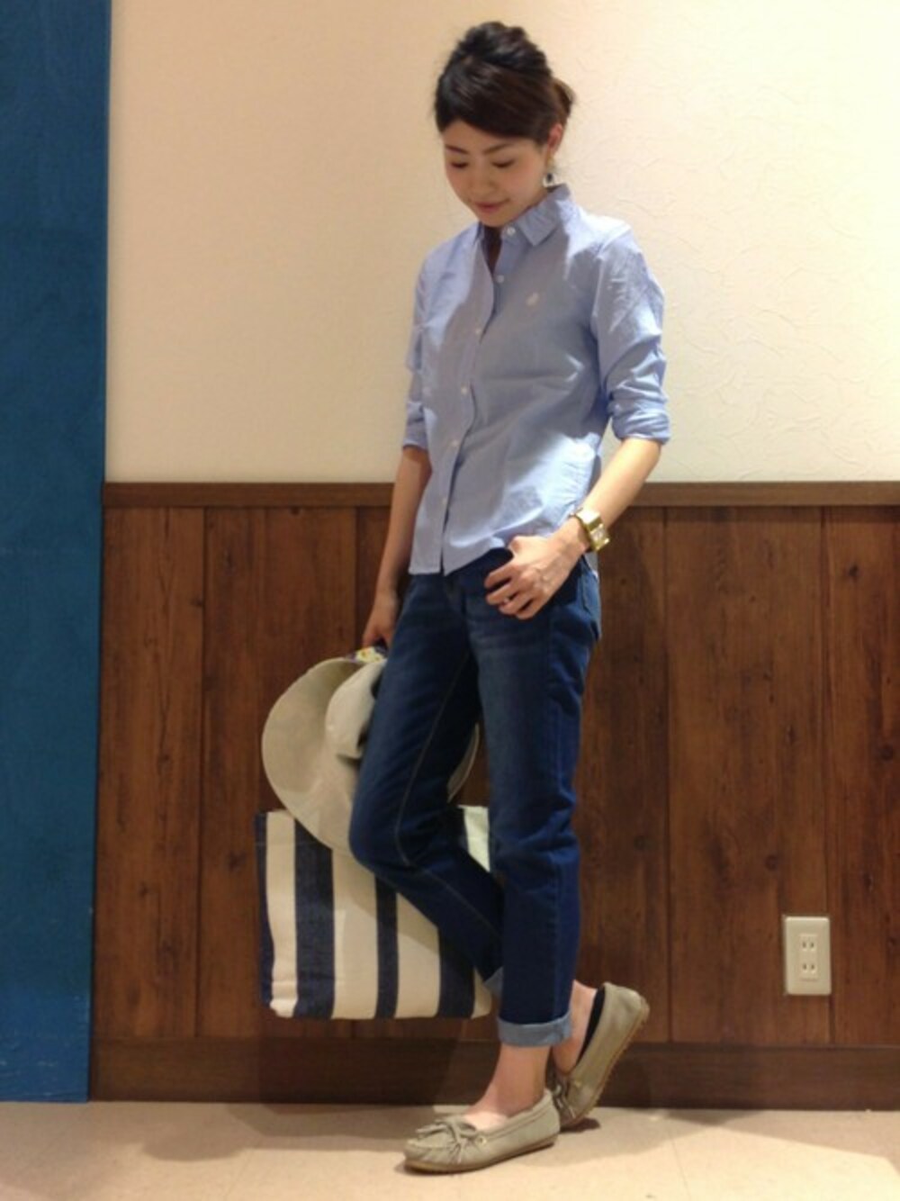 ブルートーンでまとめた涼しげなコーディネート。 ハリのあるきれいな素材感のレギュラーシャツは、カジュアルながらきちんと感も演出します。 小物はベージュで合わせて柔らかい印象に。