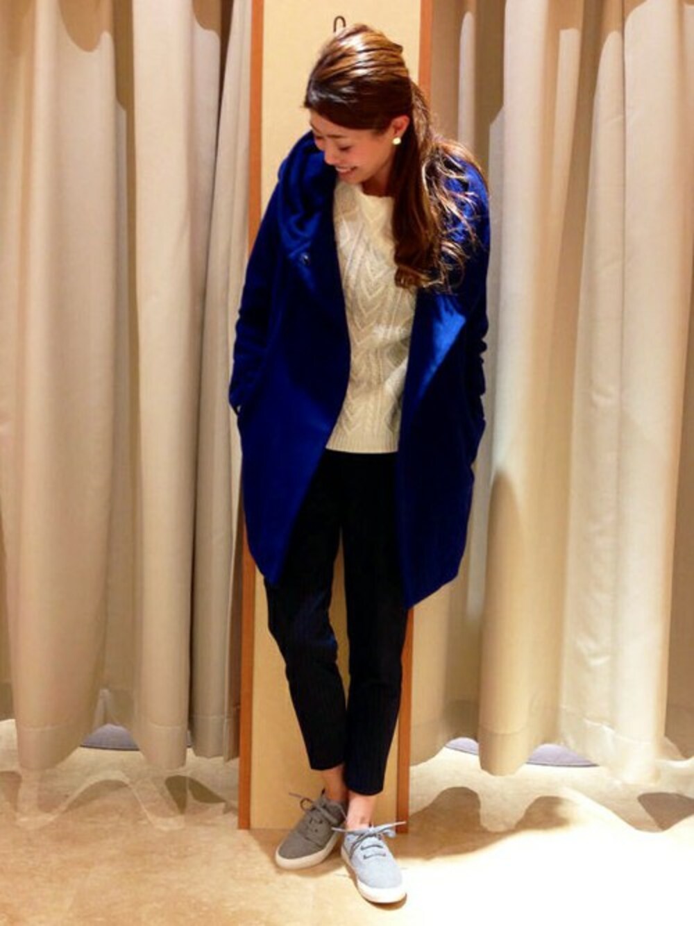 ウールモッサの着心地と、発色のよいブルーがポイントのアウターが主役。 インナーに白ニットを合わせて冬を意識しました。 トップスにボリュームがある分、テーパードパンツでコンパクトにまとめるのがポイントです。