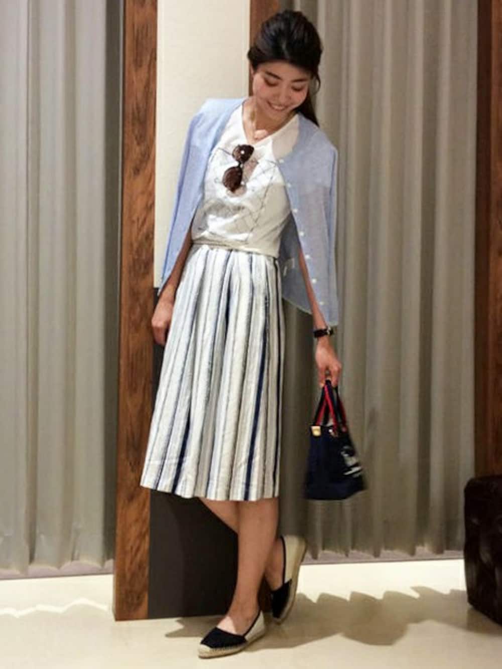 季節感のある柄使いでストライプを表現したスカートが主役。 少しラメ感のあるカーディガンは、肩からさらっと羽織って夏の日差し対策におすすめ。 ホワイトをベースにした淡いカラーの配色も涼しげです。