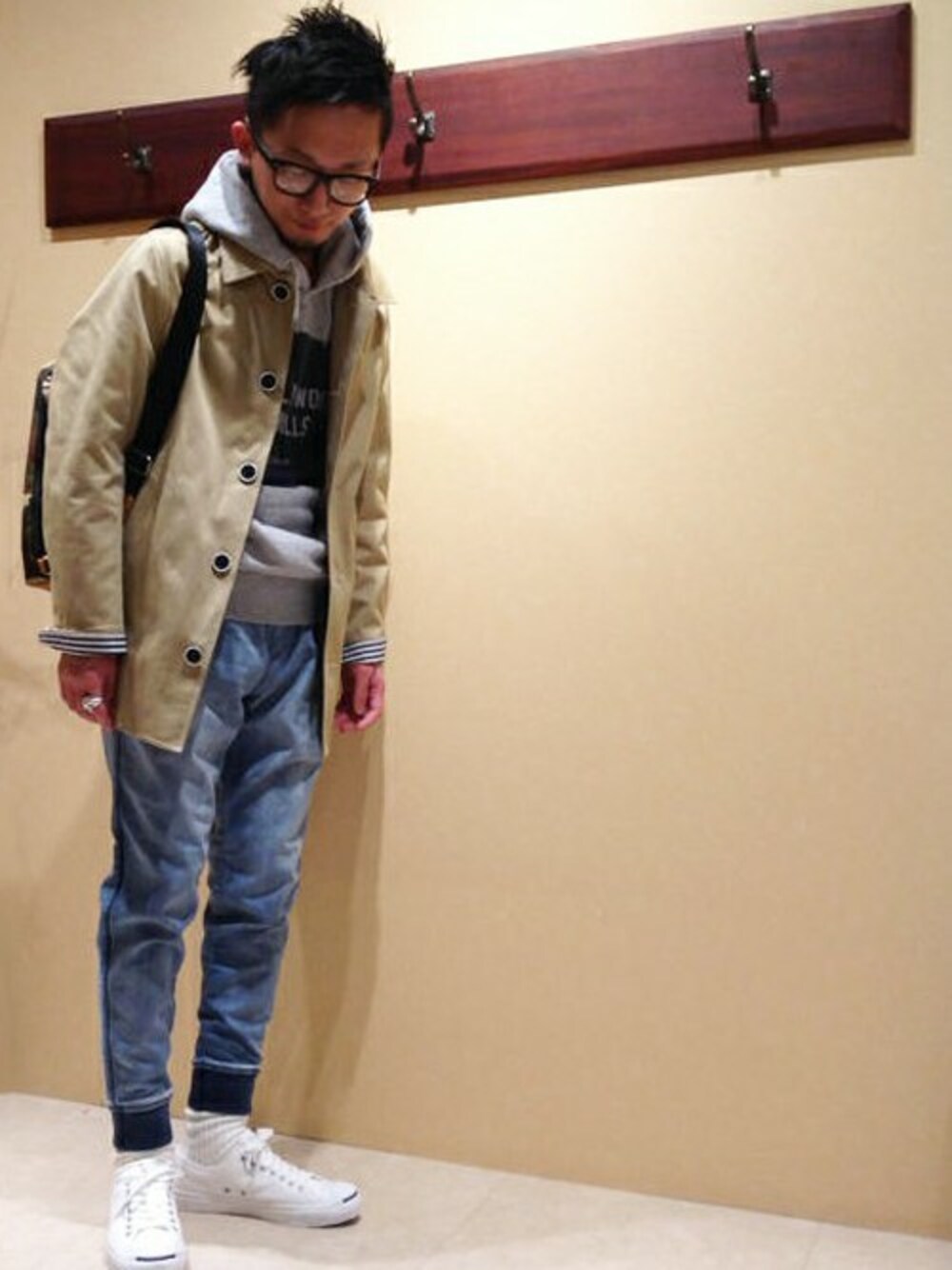 春っぽさを出すため、全身淡色でまとめてみました。 カジュアル感の強いカラーのデニムでも、細めテーパードタイプのリブパンツならすっきり見えます。 靴もスニーカーにして軽やかに、白で爽やかにまとめるのがポイントです。
