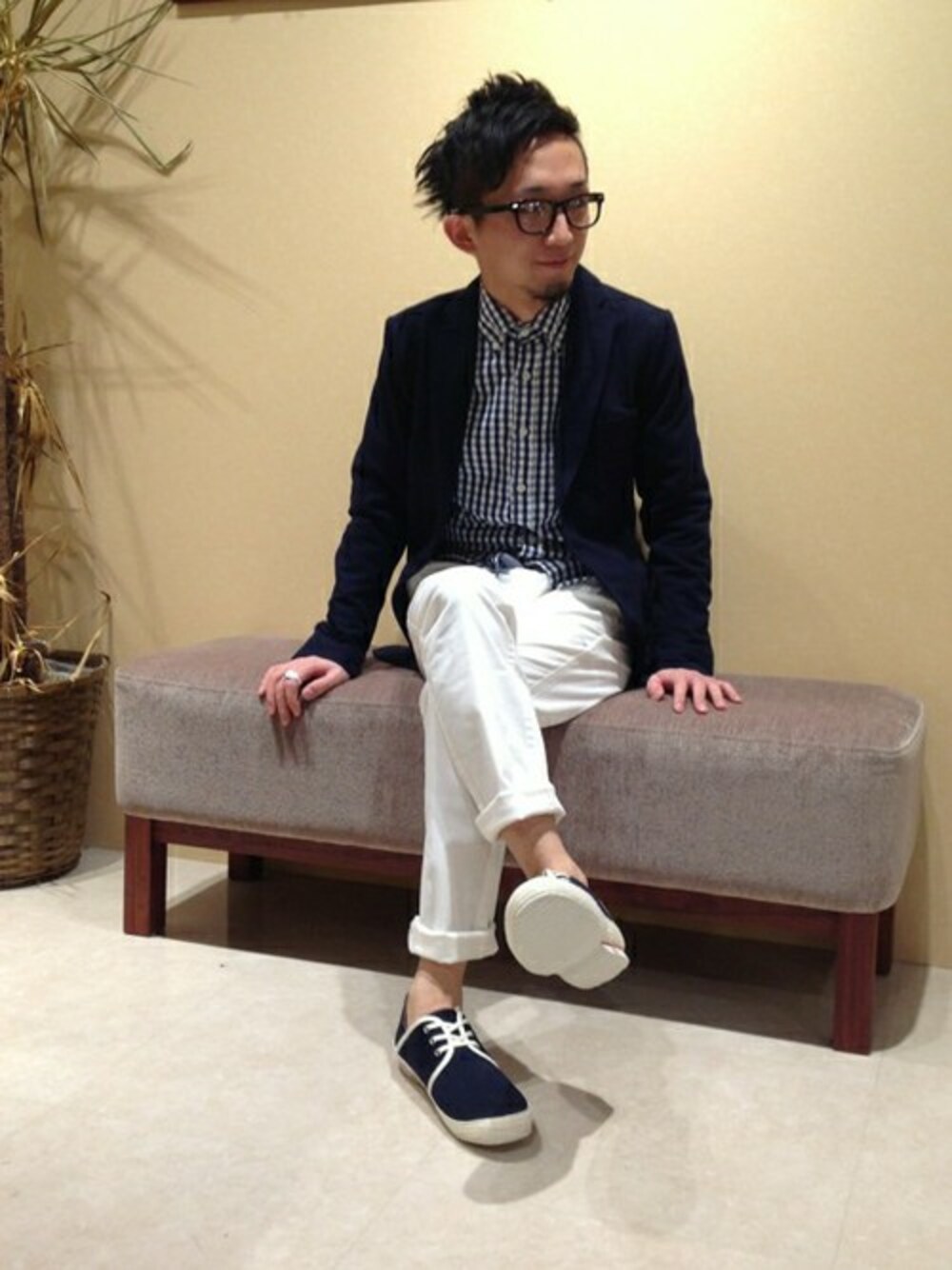 インナーのシャツをチェック柄に、パンツをロールアップして足首見せ&マリンテイストのスニーカーで軽快さと爽やかを。 カジュアル感を強くしたジャケットコーディネートです。 ホワイトパンツが一番の今年らしいポイント♪