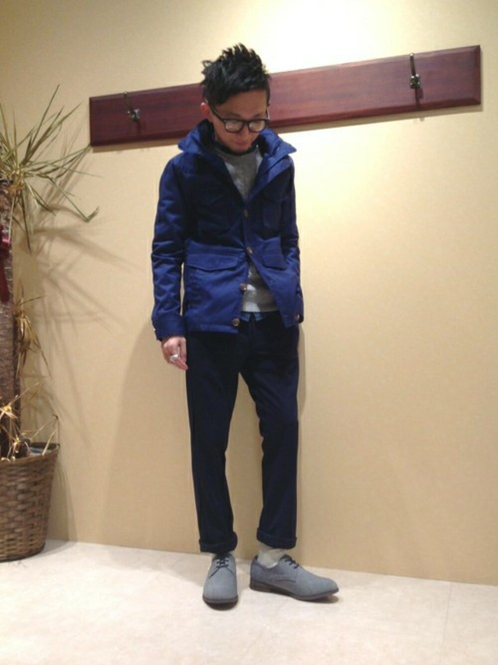 着丈が少し長めに作ってあるため、オンオフ兼用で重宝するM65ジャケットが主役。 大きめのスタンドカラーは小顔効果も高く、全身のスタイルをバランスよく見せてくれます。 バーズアイというきれい目の生地を採用し、定番のデニム合わせはもちろんトラウザーパンツとも相性がいいアイテムです。
