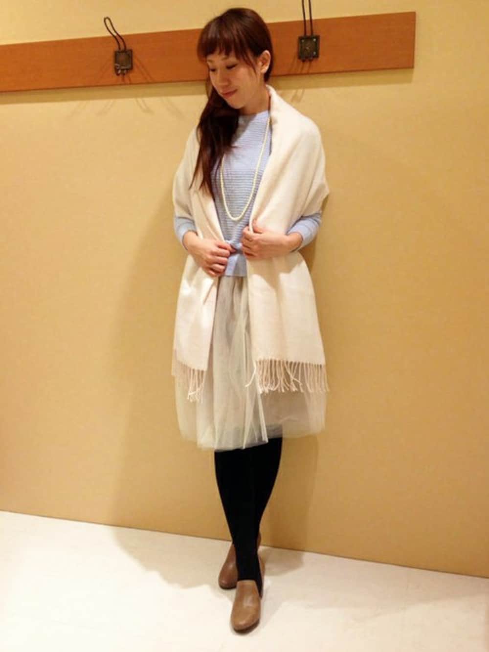 全体的に淡い色でまとめた、冬らしくてかわいいコーデです♪ トップスは毛足の長いアンゴラ混のニットだから、ふんわりやわらかくて優しい着心地が魅力。 春を想わせる色はこれから長く活躍するアイテムです。