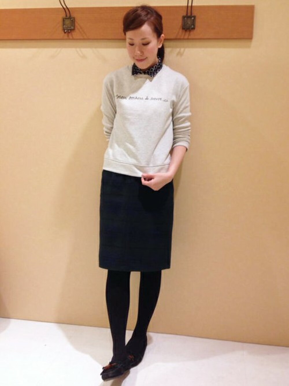 今年らしいスウェット×タイトスカートでスタイリング。 付け襟できちんと感をプラスしました。 トップスは、ラメを織り込むことでカジュアル過ぎない印象がポイントです。