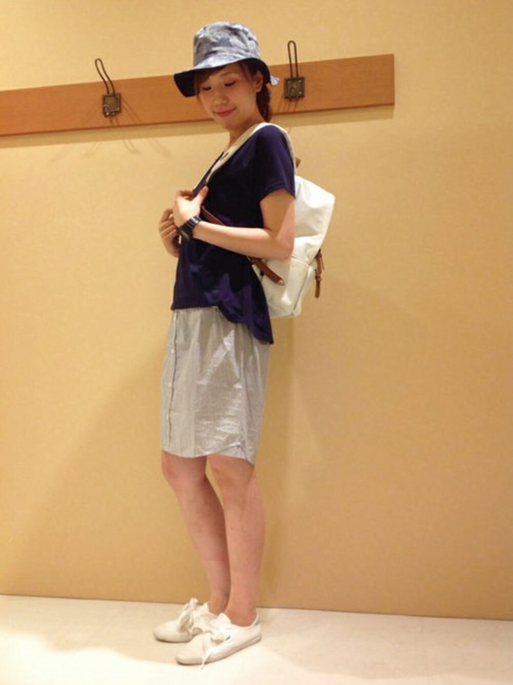シャツ生地をドッキングしたワンピースは涼しげな印象が魅力。 カモフラのハットでアクセントを与えました。 街歩きからレジャーまで、夏のお出掛けにおすすめです。