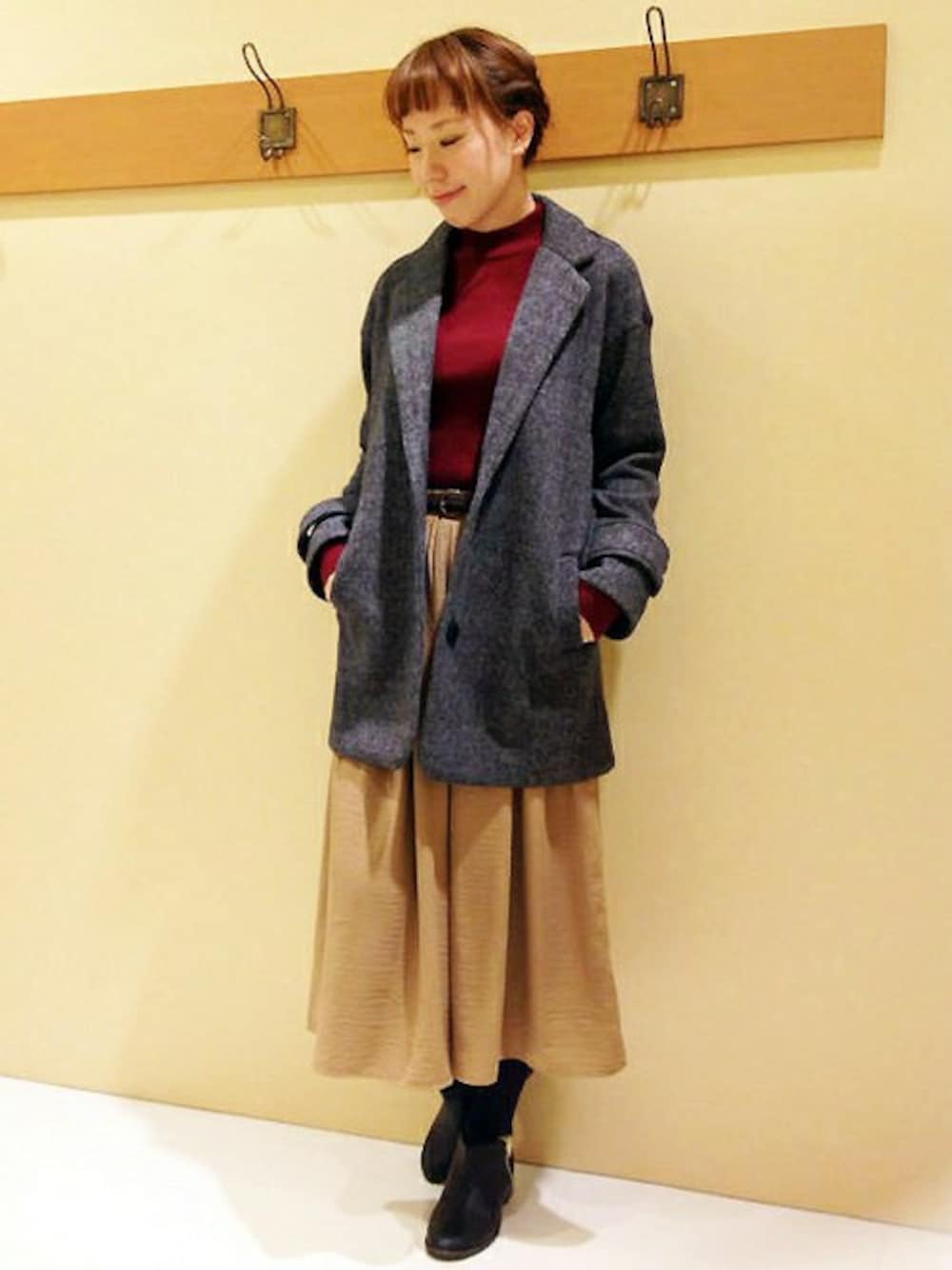 ゆる感のあるコートは、ニットとの相性抜群です。 今年らしいハイネックのニットを合わせて、デコルテラインで色を見せるのがポイント。 スカートのようなガウチョパンツで、甘さを加えました。