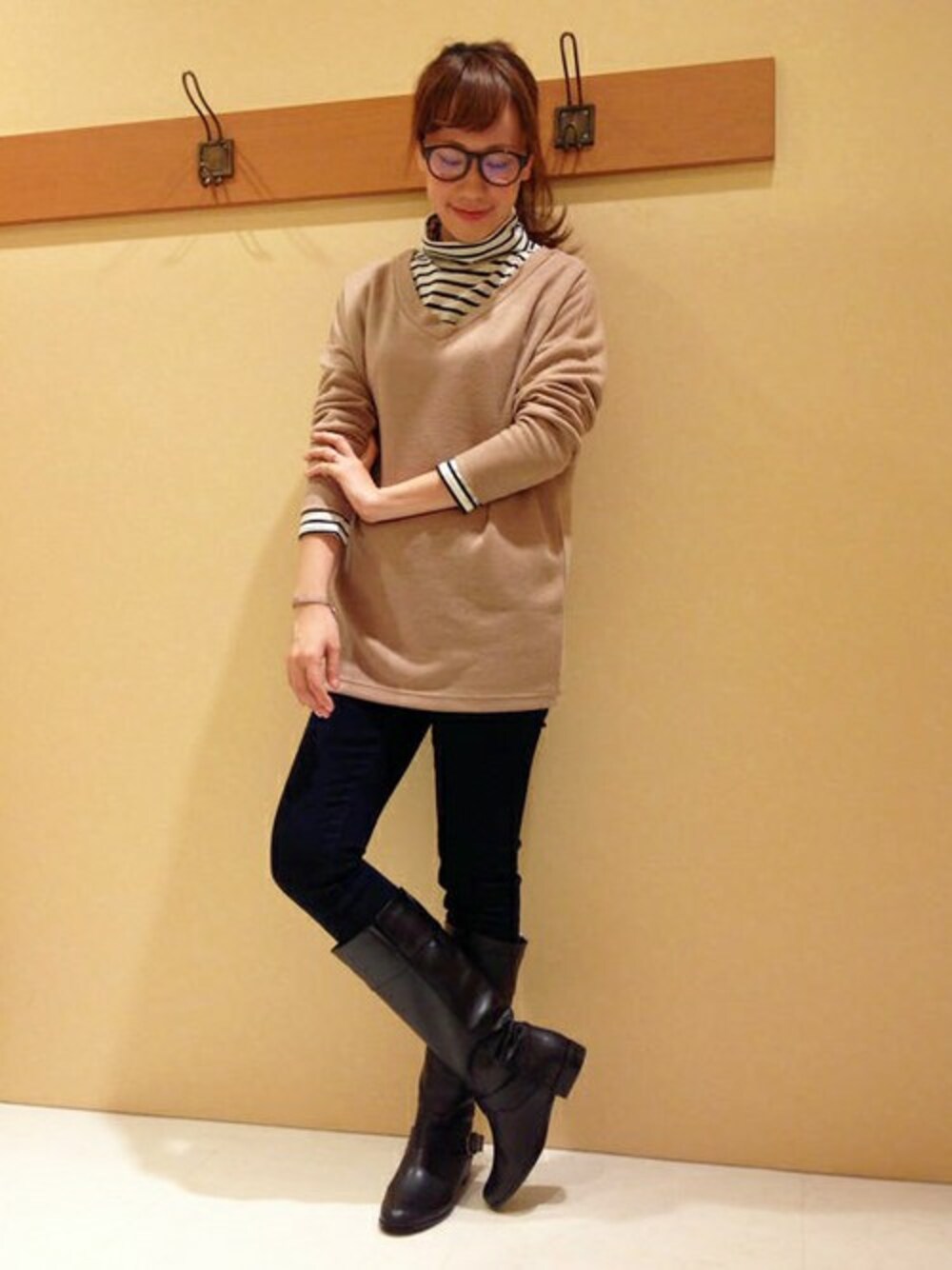 トラッドな印象の、大人カジュアルスタイルです。 ゆる感のあるトップスに、ボーダーのハイネックを合わせたアンサンブルでカジュアルな印象に。 ブラックのロングブーツでカラーを引き締めると大人っぽくなります。