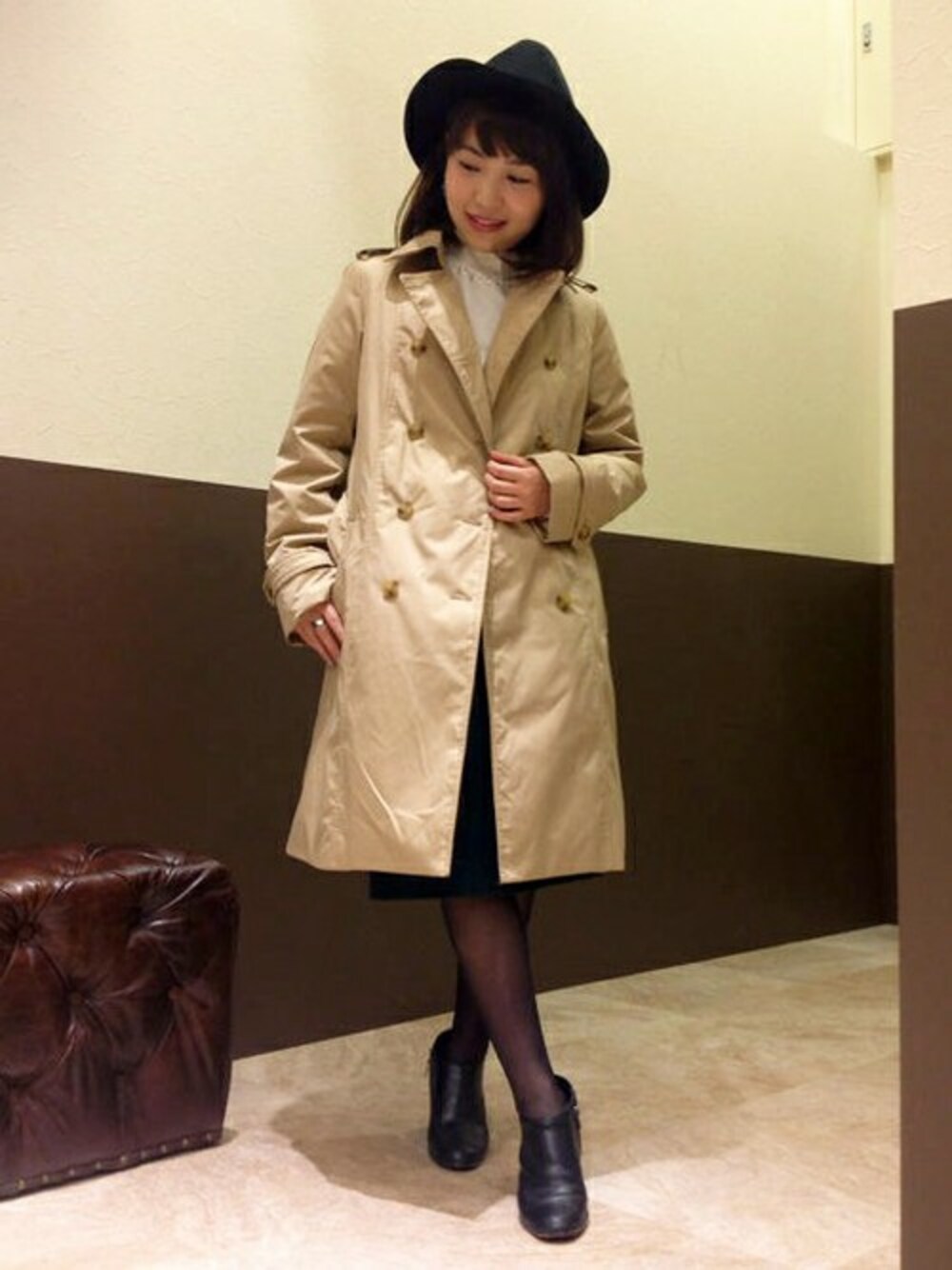 中綿にダウンを取り入れたトレンチコートは、通勤スタイルにもおすすめのアイテム。 きれいめな雰囲気を活かして、つば広ハットでカジュアルな着こなしに。 チェックのスカートも厚手素材で暖かみたっぷりにスタイリングしました。