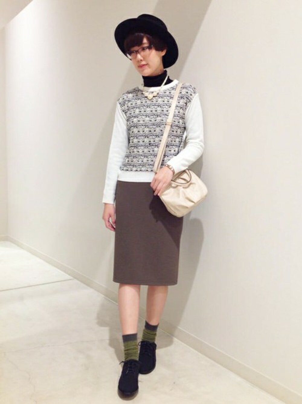 ツイード調の切り替えニットを、タートルネック&タイトスカートと合わせてぐっと今年っぽく仕上げました。 地味目なカラーのコーデでも、ネックレスやハットといった小物遣いでぱっと目を引くスタイルに♪ トップスは厚すぎず薄すぎない丁度良い生地なので、重ね着したりアウターの中に着てもすっきり着られます。