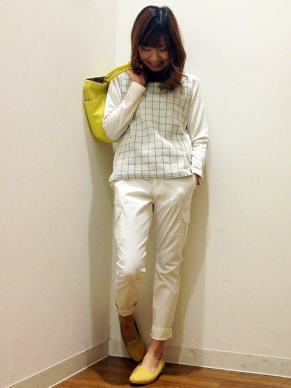 爽やかなオールホワイトに、差し色のイエローをプラス。 印象的なチェック柄のジャガードプルオーバーと、カーゴパンツでシンプル過ぎないスタイリングにしました。 春らしい気分にしたい時におすすめのコーディネートです。