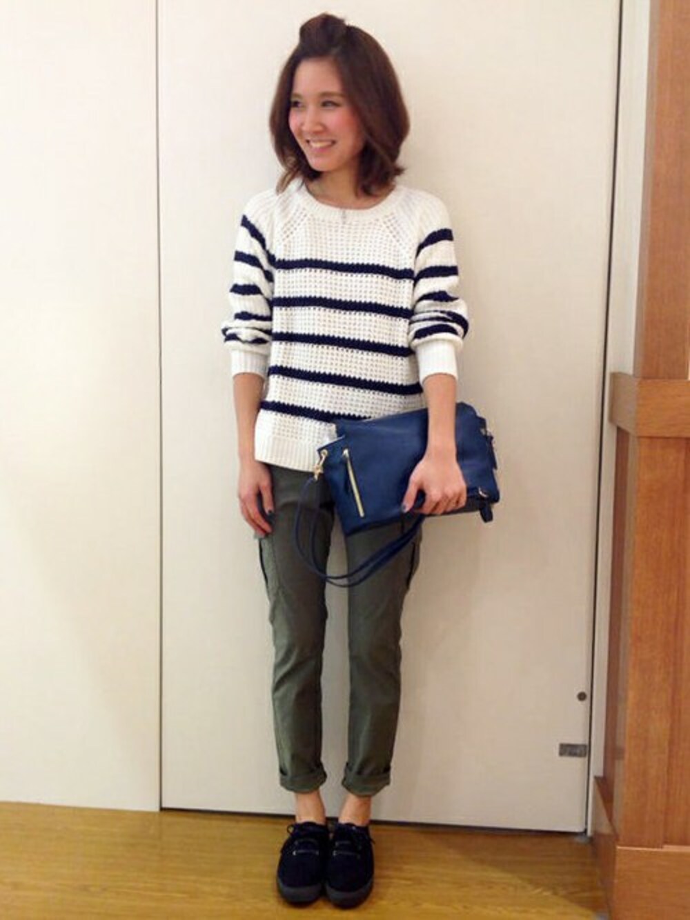 今季も注目のカーゴパンツは、短めトップスと合わせるのがおすすめ。 トップスは表情豊かなワッフル素材が魅力のアイテムです。 春らしいマリン調のボーダーで季節感もたっぷり。