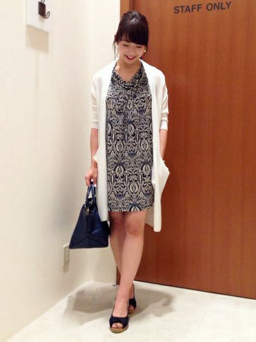 大人っぽいロングカーディガンを軸にコーディネートしました。 シックな総柄のワンピースに同じ丈感のロングカーディガンを合わせてカジュアルダウン。 無地のカーディガンから覗くワンピースの柄がアクセントです。 トートバッグは光沢のある合皮を使用したものを合わせシックにしました。 全体的にアーバンな印象で都会へのお出かけにオススメのスタイリングです。