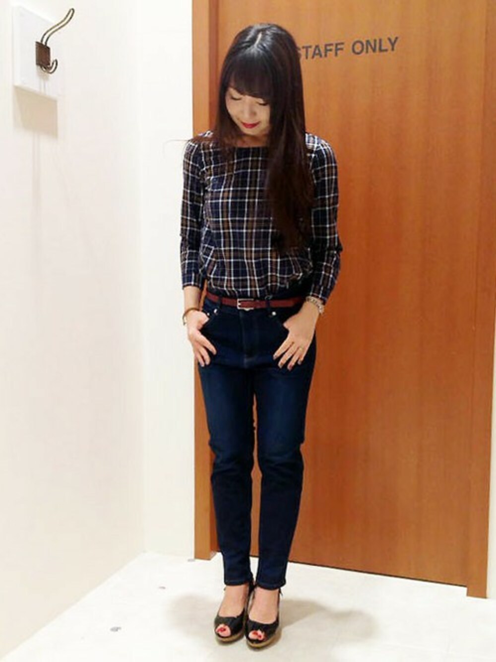 暗めの色で落ち着いた印象のカジュアルコーディネートです。 チェックブラウスを濃いめのデニムにインしてスッキリとした印象に。 足元をブーティに替えて、より秋の先取り感を出しても◎