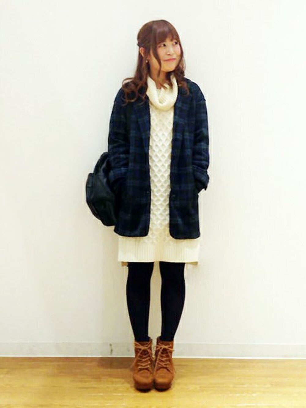 これからの季節持っておきたいニットワンピースは、今年らしいタートルネックがおすすめ。 柄物のコートはシックな色味で合わせると大人っぽい印象になります。 デートやタウンユースに着ていきたいスタイリングです。