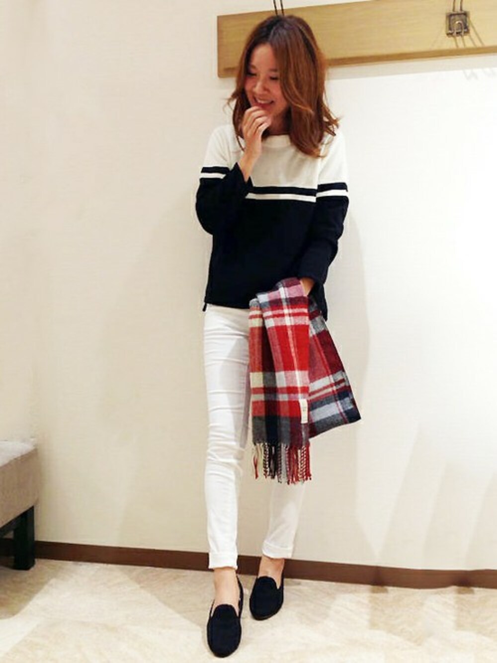 ゆったりシルエットのニットは今季持っておきたいアイテムですね。 モノトーンで合わせて、ストールで季節感ある色を差したのがポイント。 シンプルなコーディネートはアウター選びも楽しくなります。