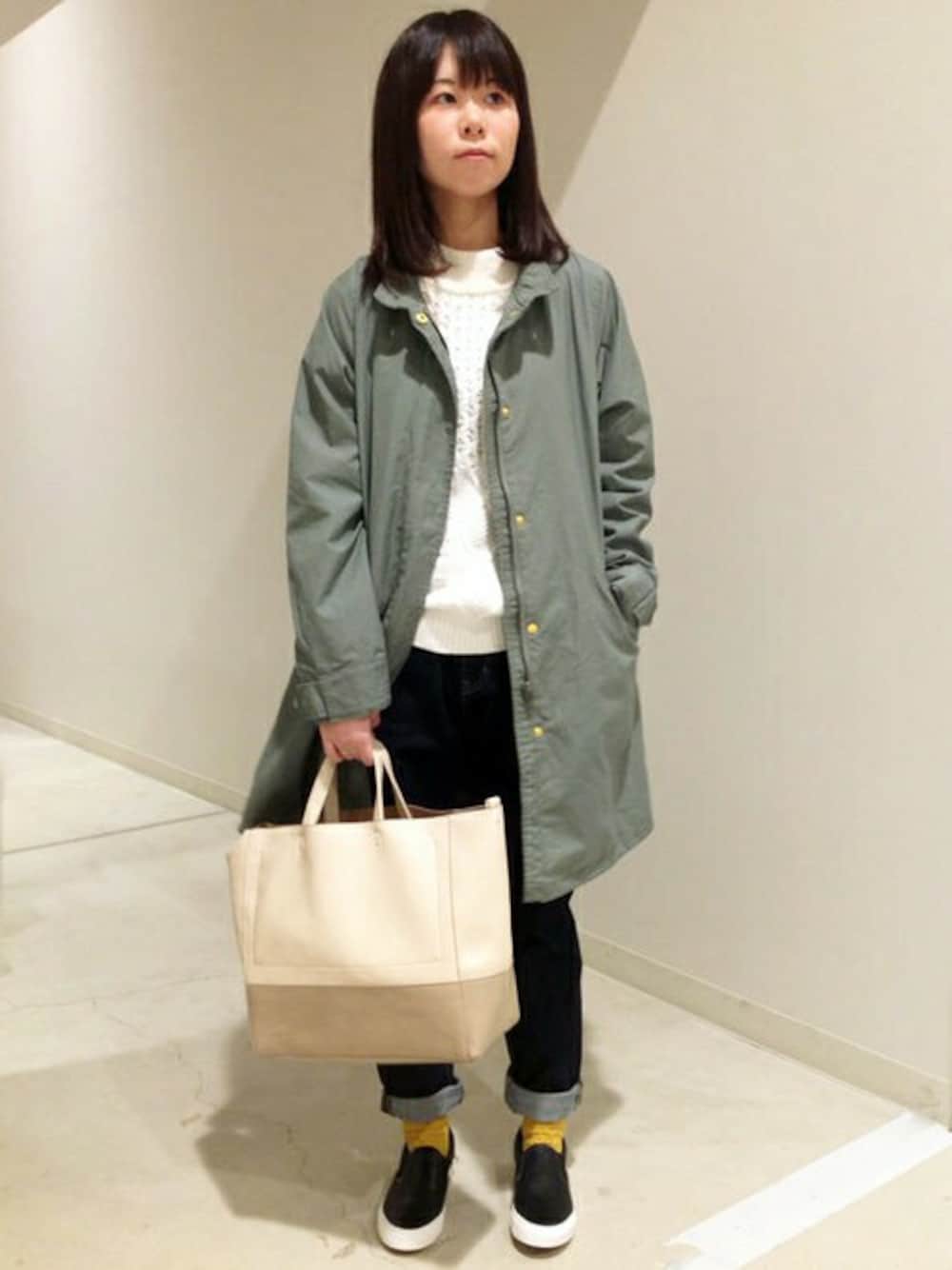 ミリタリーミックスでオトナ可愛いコーディネートです。 生地に特徴のあるフェミニンなニットが、女性らしさを加えてくれます。 モッズコートのカジュアルさは、レジャーシーンや休日の散策におすすめ。
