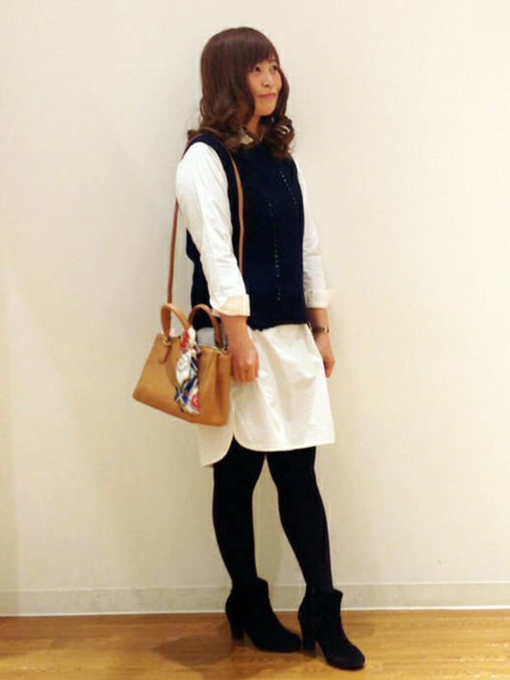 モノトーンでオトナカジュアルなデートスタイルです。 ゆったりシルエットのシャツワンピースは、二ットベストで今年らしくアップデートしました。 春らしいキャメルのバグやポイント使いのスカーフがこなれ感を加えてくれます。