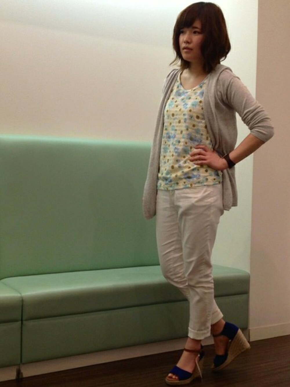 トーンを抑えたコーディネートにブルーの花柄を効かせました。 花柄のタンクトップは、上にカーディガンなど羽織るだけで初夏のスタイルが完成する便利アイテムです♪