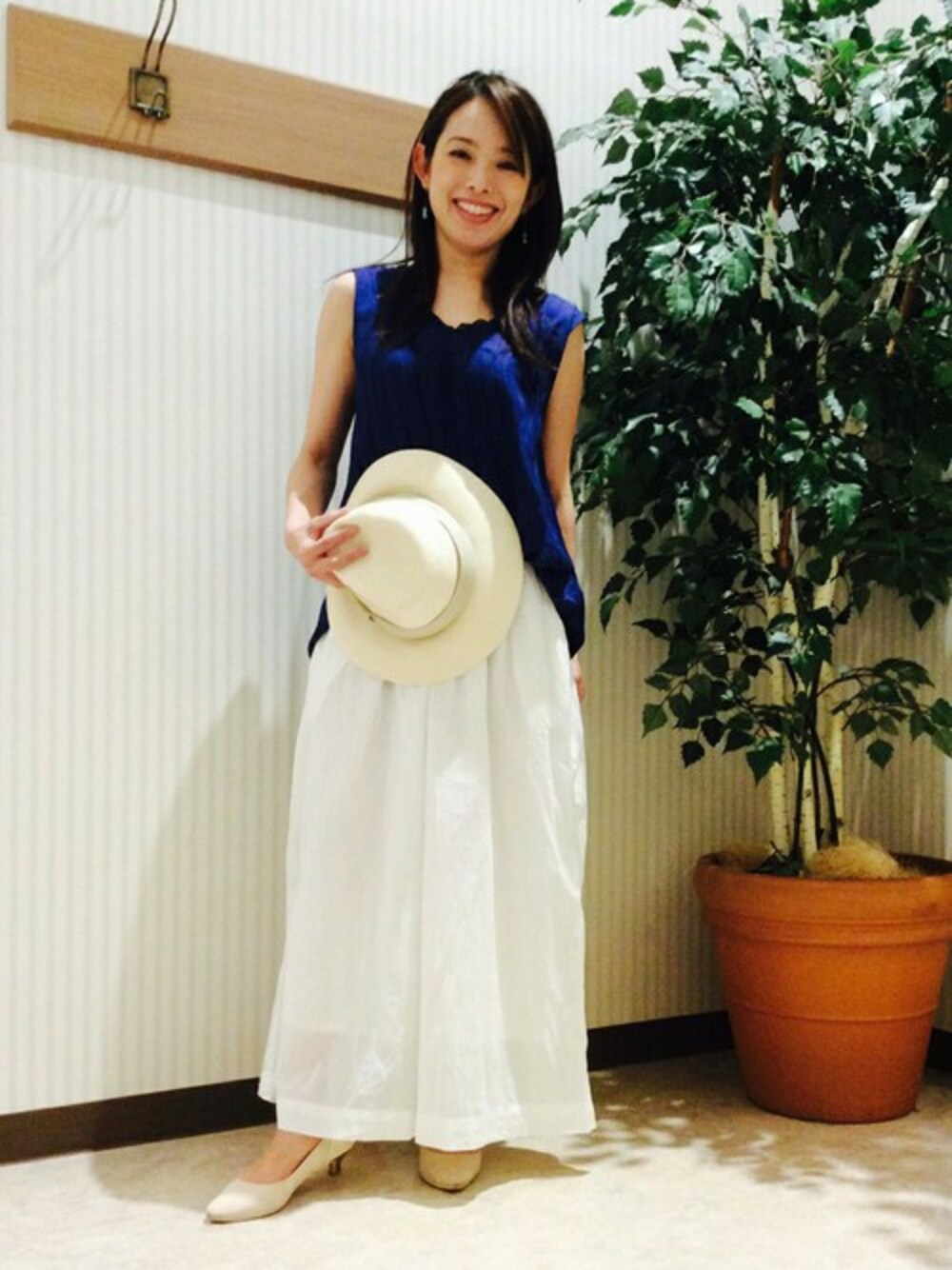 夏を先取りしたブルーカラーのノースリーブチュニックにホワイトのスカーチョで爽やかコーデ。 デートシーンはもちろん、女子会にもピッタリです。