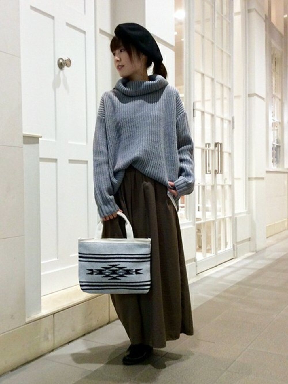 今年気になる、ゆるっとシルエットで冬のコーディネートです。 ざっくり仕上がったオフタートルニット。前身頃はシンプルですが、後身頃にスリットを施して シルキーなシフォンをドッキングされたデザインなんです。 合わせるスカートもゆったりなシルエットで、大人可愛い着こなしをおすすめします♪