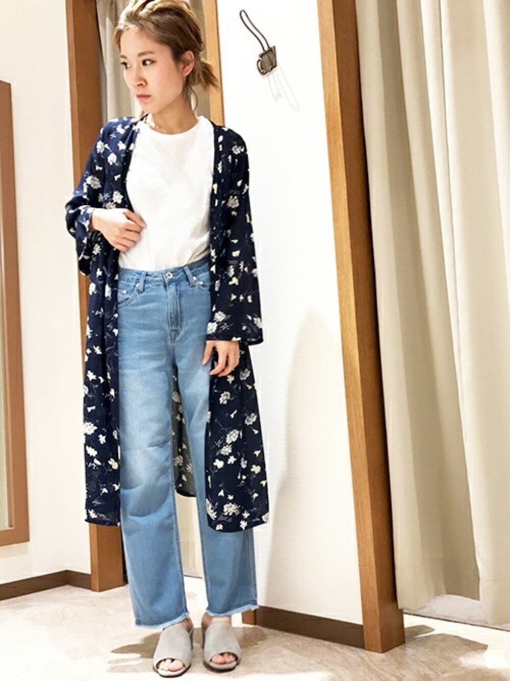 大人でも着やすい落ち着いたフラワープリントのワンピースがお気に入りです♪ 袖は今年らしくフレアスリーブで、深めのVネックも女性らしくて◎ デニムのクロップドパンツに羽織るってみると、カジュアルに抜け感をプラスできるので、こなれた感じのコーデに仕上げてくれます☆