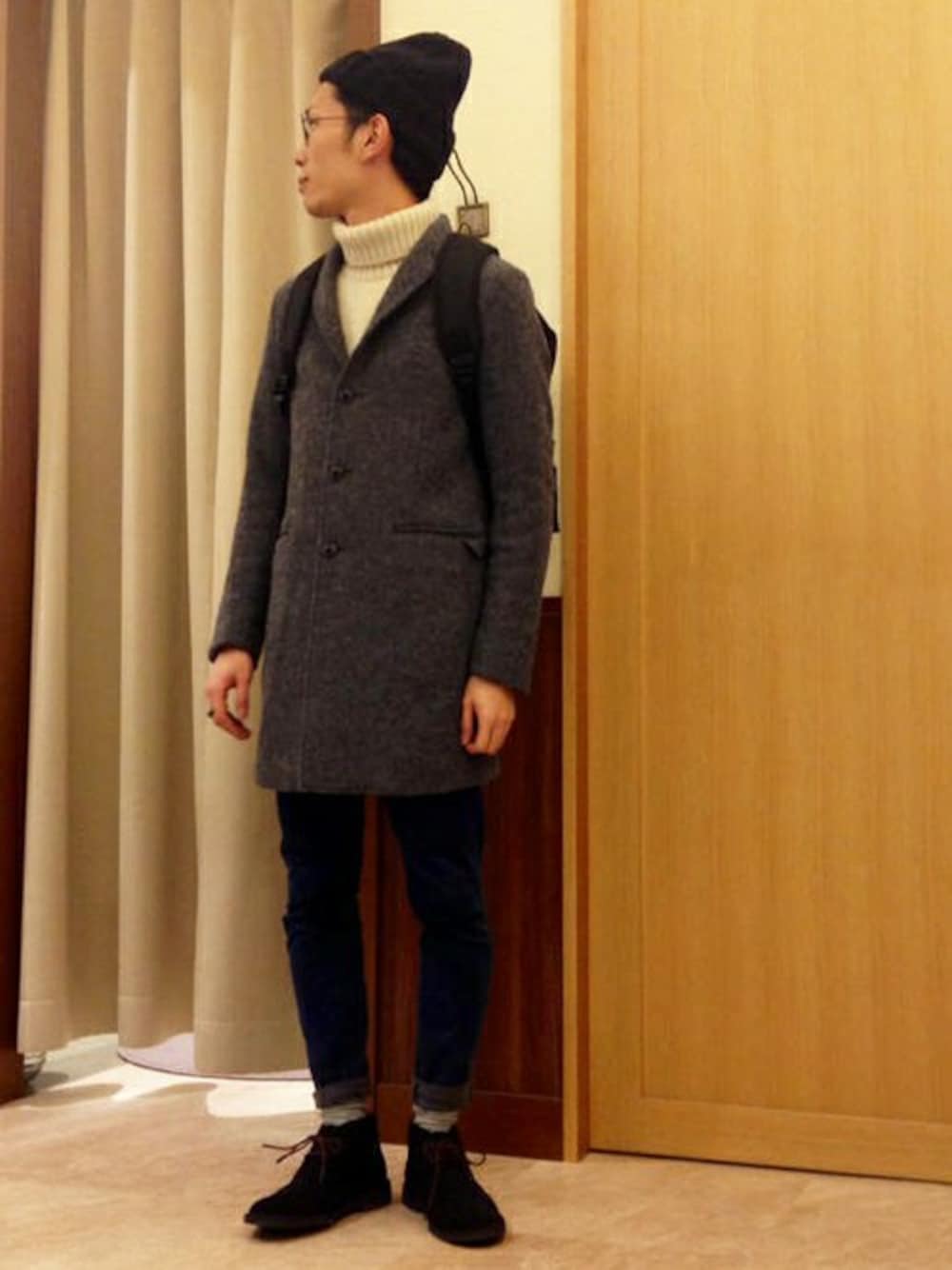チェスターコートにタートルネック合わせの最旬コーデ。 モノトーン見えする色の選択もポイントです。 都会的な印象のバックパックをアクセントに加えました。