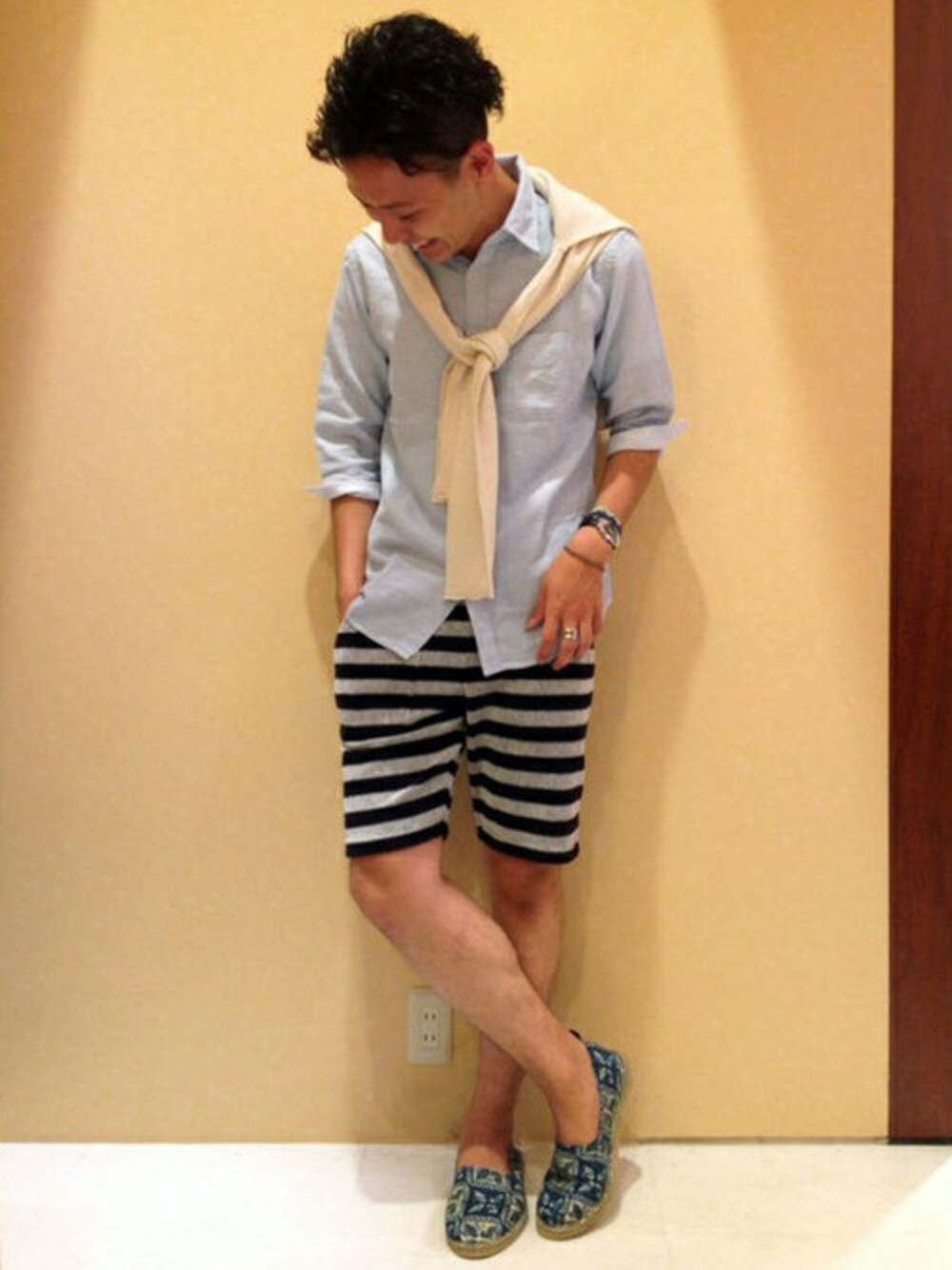 淡色のトップスで夏を感じるコーディネート。 リネン混の7分袖シャツに、涼しげな素材感のカーデを肩掛けしてアクセントに。 無地と柄のバランスで変化をつけました。