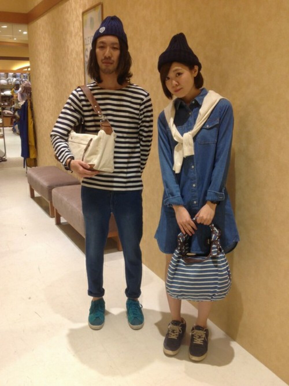 テーマは【 春マリン 】 爽やかな色合いの、おそろいカップルコーデです♪ 互いにボーダーを聞かせながら、ブルートーンで統一した正統派マリンコーデです。