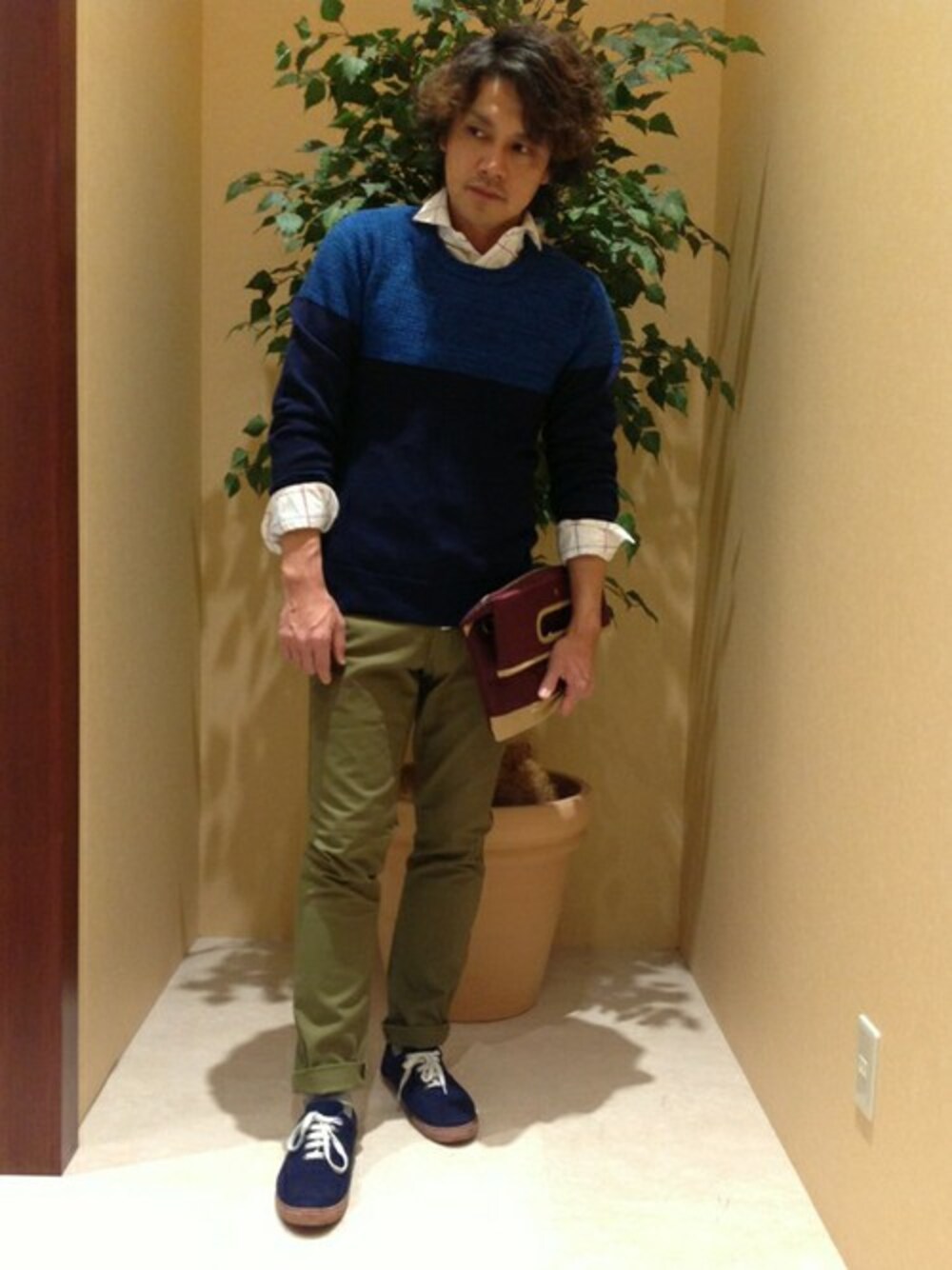 トーン合わせのバイカラーニットプルオーバーを主役にしたコーディネート。 シャツの上に麻混のニットを重ね、初夏まで使えるルックに仕上げました。 袖を捲ることで白をチラ見して、。爽やかさをプラス。