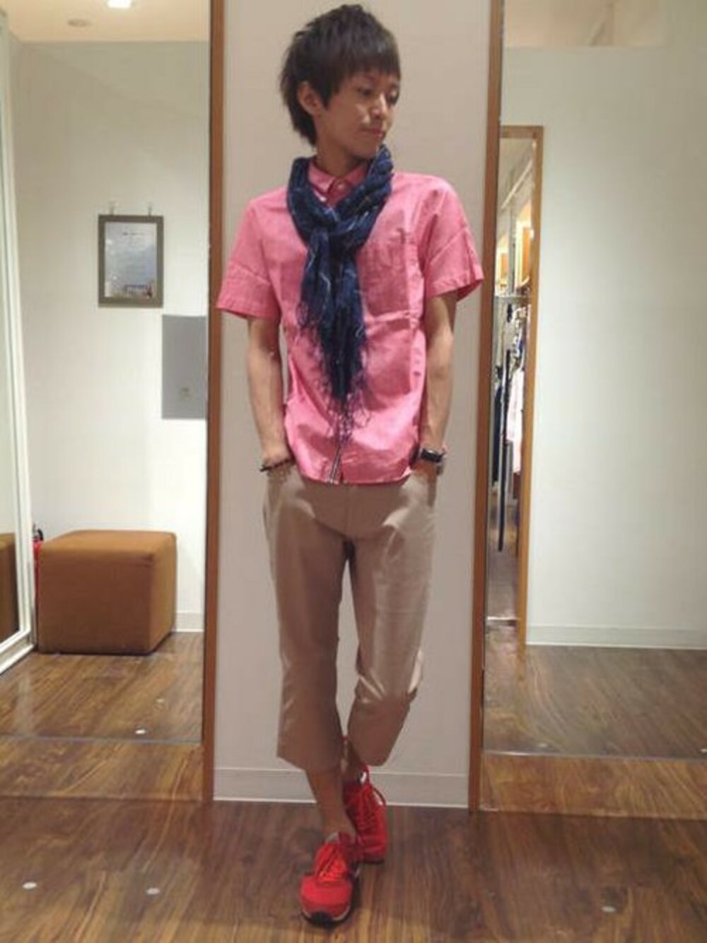 夏仕様のキレイめスタイル。 ベージュ×レッドの柔らかな雰囲気を、濃色のリネンストールで引き締めました。 足元はスニーカーにしてカジュアル味をプラス。