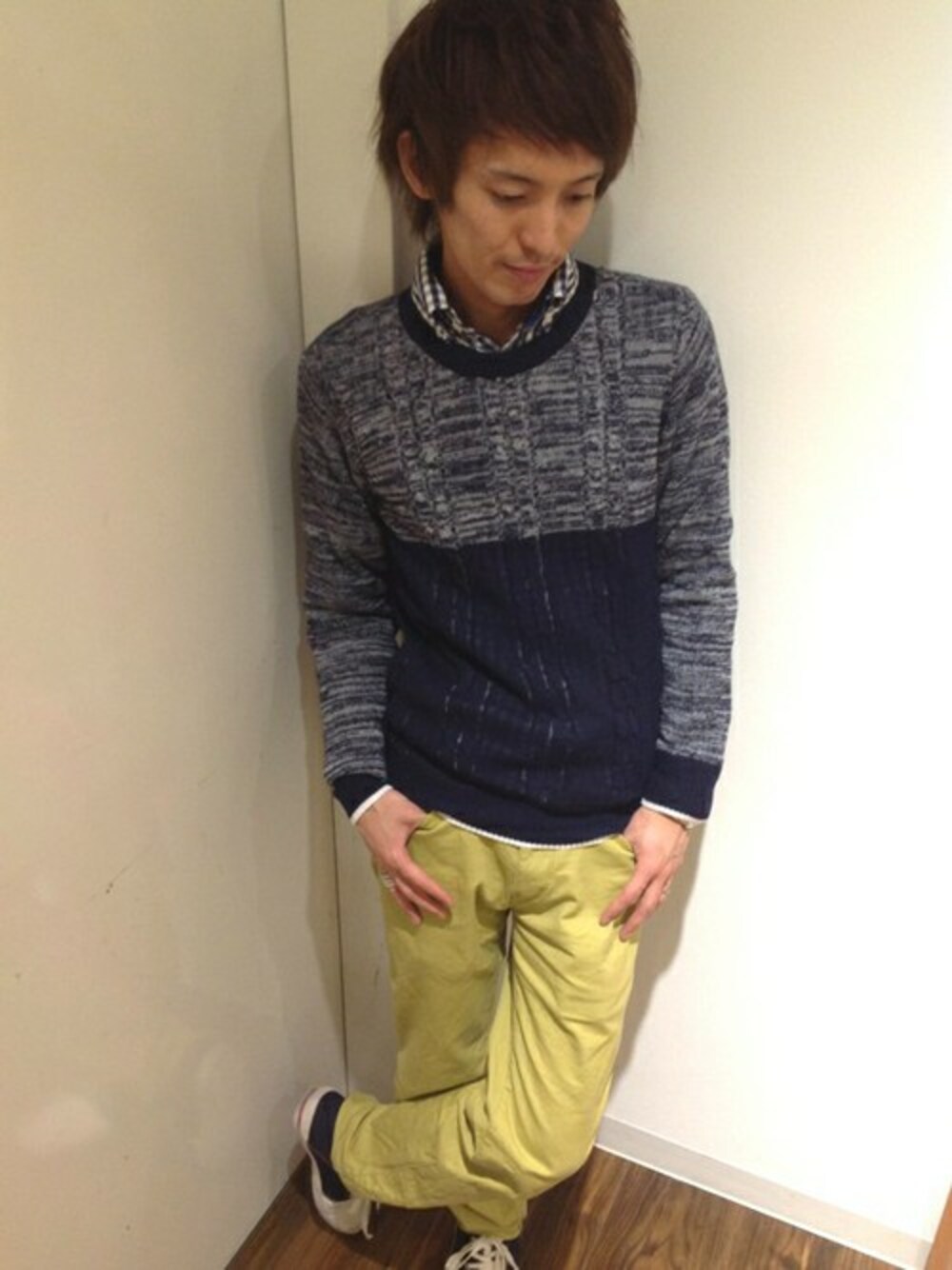 麻混素材のバイカラーニットは豊かな表情が魅力。 シャツの上に重ねても、カットソーの上にTシャツライクに着こなしてもOKなアイテムです。 ネイビーと相性のいいイエローのボトムを採用して、アクセントを付けました。