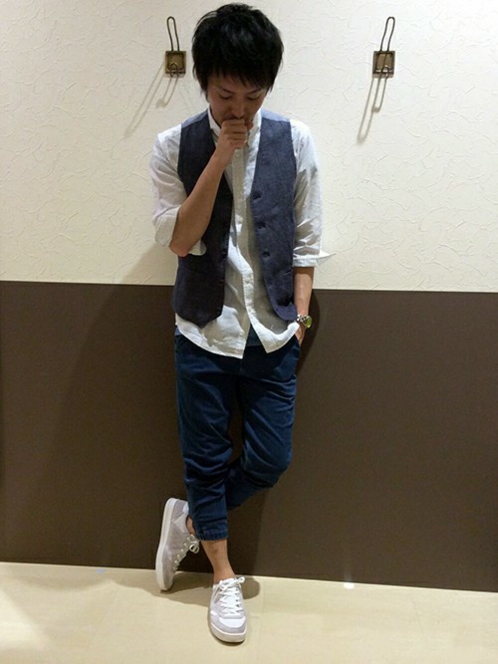 ベストにシャツを合わせたきれいめカジュアルコーデ。 今注目のジョガーパンツを合わせればゆるカジスタイル。 デートシーンで大活躍です。。