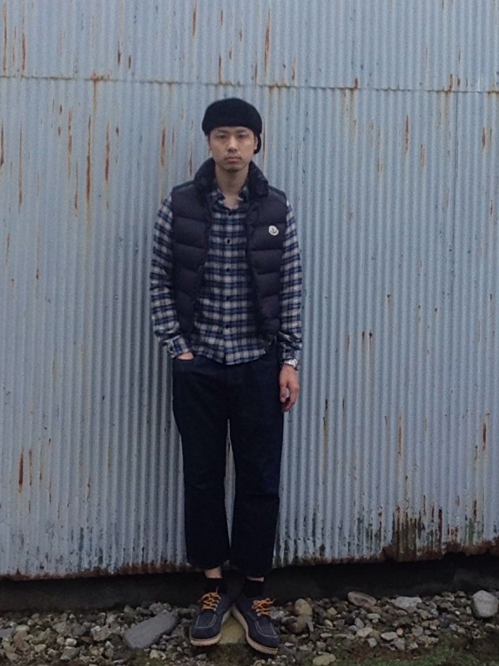 早い?ですが、ダウンベストコーデ。キャスケットは前後逆で。ベドのパンツは九分丈で、足元はRED WING×BEAMSです。色味が春っぽい… ダウンベストはサイズ0なんで、丈が足りてませんです。涙