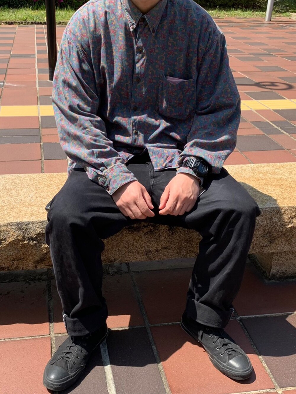 全て90sのコーデ シャツ 90s オールドギャップ ペイズリー 総柄 パンツ 90s リーバイス501 ブラックデニム スニーカー 90s コンバース ハイカット