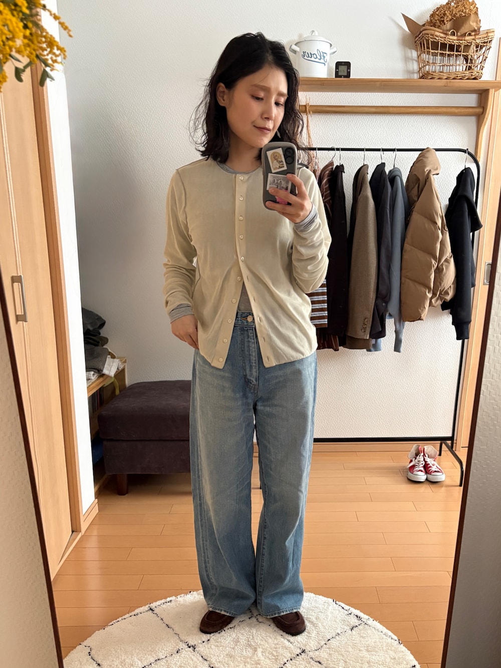 お気に入りのデニムと春色カーディガン♡
