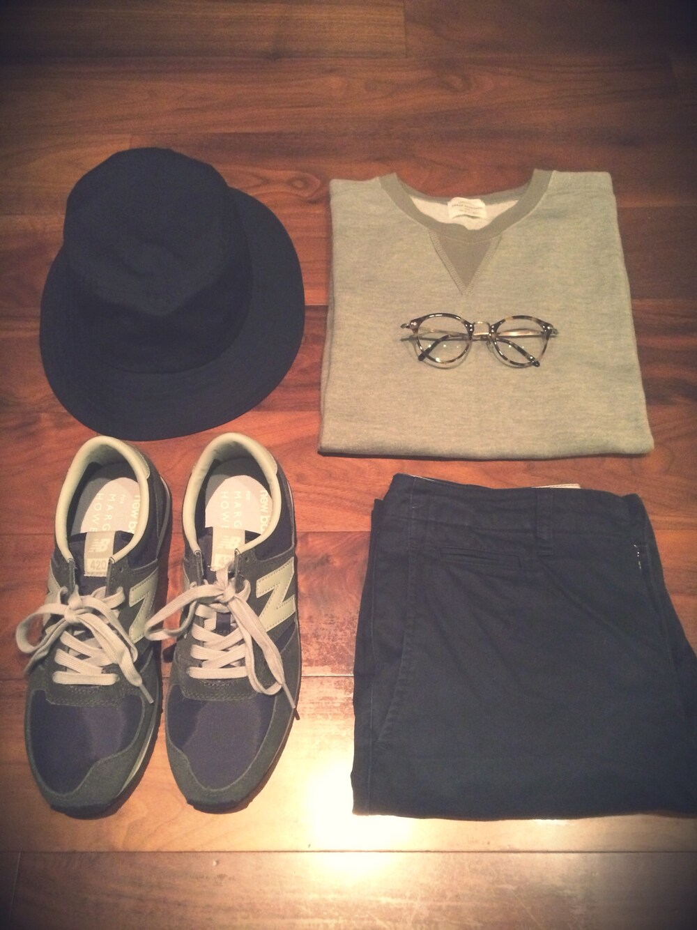 my standard hat:無印 tops:URBAN RESEARCH pants:無印 shoes:MARGARET HOWELL × NEW BALANCE 420 eyewear:OLIVER PEOPLES navy×gray